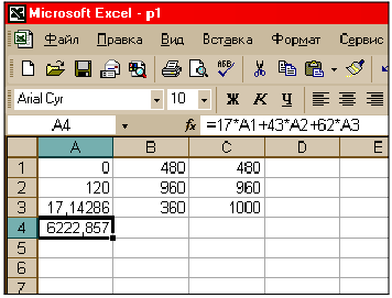 Затем введём в ячейки С1, С2 и С3 значения 480, 960 и 1000 соответственно, ограничивающие численные значения переменных задачи.