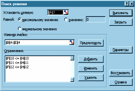4.4. Заполнить параметры диалогового окна Поиск решения.