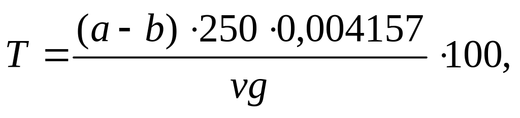 где а — расход раствора перманганата калия концентрацией 0,1 моль/дм3 на титрование рабочей пробы, см3; b — расход раствора перманганата калия концентрацией 0,1 моль/дм3 при контрольном титровании, см3; v—объем пробы разбавленного экстракта, взятый на титрование, см3, v = 5 см3; g — масса навески абсолютно сухой древесины или коры, г; 0,004157 — масса таннинов, соответствующая 1 см3 раствора перманганата калия концентрацией 0,1 моль/дм3, г.