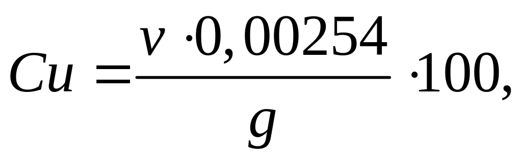 где v — объем раствора перманганата калия концентрацией 0,04 моль/дм3, израсходованный на титрование, см3; 0,00254 — масса меди, соответствующая 1 см3 раствора перманганата калия концентрацией 0,04 моль/дм3, г; g — масса абсолютно сухой навески целлюлозы, г.