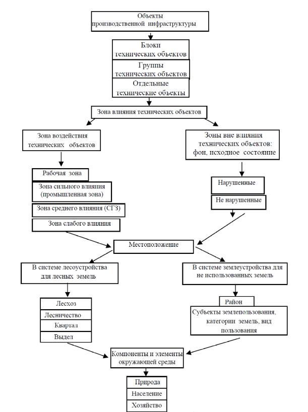 С учетом сказанного принята следующая схема формирования пространственной структуры сети экологического мониторинга (рис. 6.3). Все пункты и маршруты наблюдения должны быть ординированны относительно производственных объектов НГК (нефте-газовых комплексов). Экологический контроль осуществляется в следующих зонах: рабочей, промышленной, санитарно-защитной, буферной и фоновой.