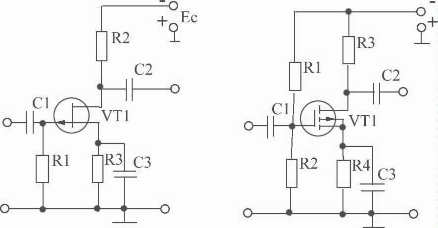 Полевой транзистор, как любой активный электронный элемент с тремя выводами, может быть включен в усилительную схему тремя способами. В зависимости от того, какой вывод является общим для входной и выходной цепи различают схему с общим истоком, с общим стоком и общим затвором (рисунок 6.6). Основной схемой включения полевого транзистора является схема с общим истоком (рисунок 6.6а). Так же как и в схемах на биполярных транзисторах в выходной цепи (стоковой) необходимо установить ток покоя стока Iсо. Это можно выполнить либо с помощью резистора, включенного в цепь истока и зашунтированного конденсатором для пропускания переменного входного сигнала к истоку (автоматическое смещение), либо с помощью делителя напряжения в цепи затвора (рисунок 6.7).