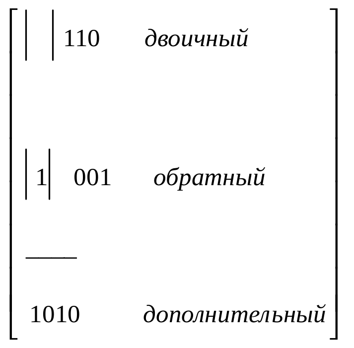 Для представления числа в дополнительном коде: в знаковом разряде (он располагается перед старшим разрядом) записывается "1", а в цифровых разрядах "0" заменяют "1" и наоборот (это обратный код), затем в младшем разряде (для отрицательного числа) прибавляется "1". Для положительного числа дополнительный код совпадает с прямым.