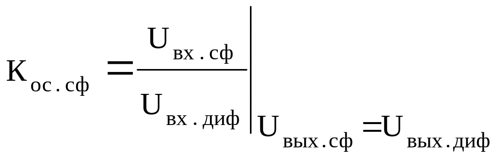 Коэффициент ослабления синфазных входных напряжений (Кос.сф) характеризует способность ОУ подавлять сигналы приложенные к обоим входам одновременно. Кос.сф определяется как отношение напряжения синфазного сигнала, поданного на оба входа, к дифференциальному входному напряжению, которое обеспечивает на выходе тот же сигнал, что и в случае синфазного напряжения: