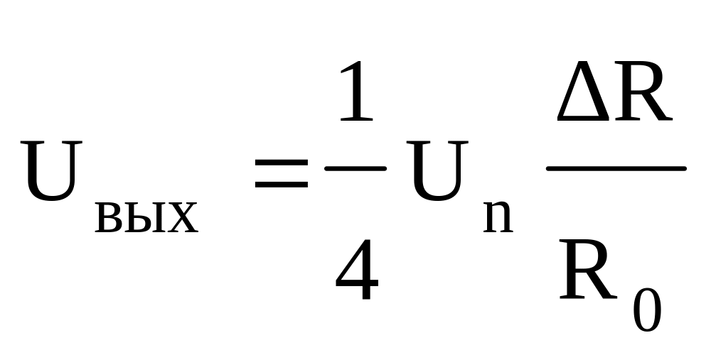 Широкое распространение в качестве преобразователя "сопротивление-напряжение" находят мостовые схемы (рисунок 3.5в).Такие преобразователи обладают рядом преимуществ: возможность получения выходного напряжения, изменяющегося относительно нулевого значения; более высокая чувствительность и линейность преобразования и т.п. Выходное напряжение равноплечего моста (R1 = R2 = R3 = R4 = R0) при условии, что датчик включен в одно из плеч моста и сопротивление нагрузки много больше R0, определяется соотношением