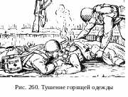 В случае горения напалма заливание водой не помогает, а попытки стряхнуть его приводят лишь к распространению ожога. Поэтому необходимо сбросить одежду, засыпать горящее место песком или землей. На обожженные участки накладывают асептическую или специальную ожоговую повязку. Приставшие к обожженным участкам остатки одежды не отдирают, пузыри не вскрывают.