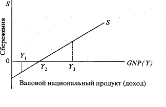 График сбережений показывает, что при доходе, равном Y1 , сбережения имеют отрицательное значение (сбережения сокращаются), при доходе Y2 , сбережения равны нулю. Они возникают и начинают расти за пределами Y2 и по мере увеличения дохода возрастают абсолютно и относительно, т.е. по мере роста дохода доля сбережений в доходе растет.