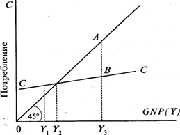 При объеме дохода, равном Y2 , весь доход идет на потребление, за пределами Y2 при Y3 часть дохода (Y3 В) потребляется, а часть (АВ) сберегается. При этом по мере роста дохода потребление абсолютно растет, но доля его в доходе имеет тенденцию к сокращению. Как писал Дж. Кейнс, «люди склонны, как правило, увеличивать свое потребление с ростом дохода, но не в той же мере, в какой растет доход».