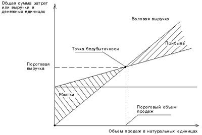 Точка безубыточности на графике – это точка пересечения прямых, построенных по значению совокупных затрат и валовой выручки (рис. 1). В точке безубыточности получаемая предприятием выручка равна его совокупным затратам, при этом прибыль равна нулю. Размер прибыли или убытков заштрихован. Если предприятие продает продукции меньше порогового объема продаж, то оно терпит убытки, если больше – получает прибыль.