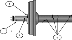 Не допускаются к эксплуатации колесные пары, имеющие трещины в любой части оси (рис. В19). Наиболее опасными в эксплуатации являются поперечные трещины. Такие трещины возникают на шейке оси (1), на галтели шейки оси(2), на цилиндрической поверхности галтели предподступичной части(3), в средней части оси(4).