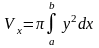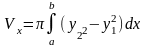 Если фигура, ограниченная кривыми у1 = f1(x) и у2 = f2(x) [0≤f1≤f2] и прямыми х = а, х = b, вращается вокруг оси Ох, то объем тела вращения вычисляется по формуле