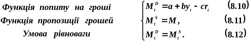 Рівновага на ринку грошей задається таким співвідношення між процентною ставкою та рівнем доходу, при якому попит па гроші дорівнює їх пропозиції. Наведемо одну із нестохастичних форм такої моделі: