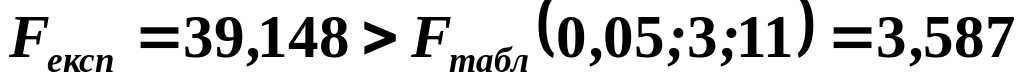 Експериментальне значення F-статистики є більшим від табличного при заданому рівні значущості 0,05 та числі ступенів свободи 3 та 11: