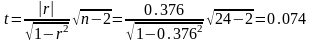 Для доверительного уровня 5% и числа степеней свободы 22 критическое значение критерия найдем при помощи функции «СТЬЮДЕНТ.ОБР.2Х(α; k)».