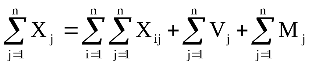У балансі відображені не тільки виробничі матеріальні витрати, але й обсяги продукції за видами діяльності. Так, обсяг продукції 1-го виду діяльності характеризується сумою оплати праці V1 і чистого доходу (прибутку) М1. Підсумок виробничих витрат і чистої продукції дорівнює валовій продукції певного виду діяльності, тобто для 1-го виду діяльності – величині Х1. У такий спосіб можна записати: