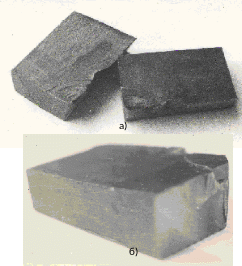 Подобные рассмотренным на рисунке П2.2.6б виды поломок со срезом державок показаны на рисунке П2.2.6в. Однако, здесь на изломе державок ножей видны изменения структуры материала (стали) державок. Произошедшее укрупнение зерна очевидно произошло в результате перегрева державок при пайке твердосплавных пластин. Здесь же можно отметить отсутствие изгиба державок ножей, который имеет место у ножей на рисунке П2.2.6б, что свидетельствует о меньших нагрузках, при которых поломаны ножи. Т.е. укрупнение зерна привело к снижению прочности ножа.