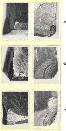 значительных нагрузок по задней поверхности, например, в случае внезапного останова шпинделя станка, о чем подробнее будет сказано ниже. Однако, более вероятными причинами данного разрушения, особенно представленного на рисунке П2.2.5б, является удар ножа режущей пластиной о твердый (например, металлический) предмет при его выбивании из фрезы, при транспортировке фрезы или же при падении в ящик с другими ножами, предназначенными для отпайки. Разрушения данного вида следует относить к поломкам (3-я стадия отказа рабочего элемента). Для уменьшения количества случаев с разрушениями данного вида следует при выбивании из фрезы под ножом располагать войлочные или деревянные подкладки для смягчения удара, транспортировку фрез следует осуществлять на деревянных подкладках, не допускающих их ударов друг о друга.