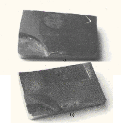 Разрушения, показанные на рисунке П.2.2.10а и на правом ноже, на рисунке П.2.2.10б, появились в результате чрезмерно сильного удара по ножу при сборке фрезы. Удар при добивании ножа пришелся и по краю твердосплавной пластины. На левом ноже, на рисунке П.2.2.10б приведен пример разрушения режущей пластины, полученного в результате неправильного хранения ножей – при упоре в край другого ножа (хранения «навалом»). Случаи разрушения, приведенные на рисунок П.2.2.10, следует отнести к 3-ей стадии отказа рабочего элемента фрезы, т.к. дальнейшее использование этих ножей невозможно. В этих случаях, хотя и вышла из строя та часть фрезы, которая непосредственно прилежит к процессу резания, они в классификацию не вписываются, т.к. во-первых отказ ножей (рабочих элементов) рассматривается в отрыве от фрезы и во-вторых после участия этих элементов не в процессе резания, а в процессе восстановления режущих свойств фрезы или в процессе хранения ножей.