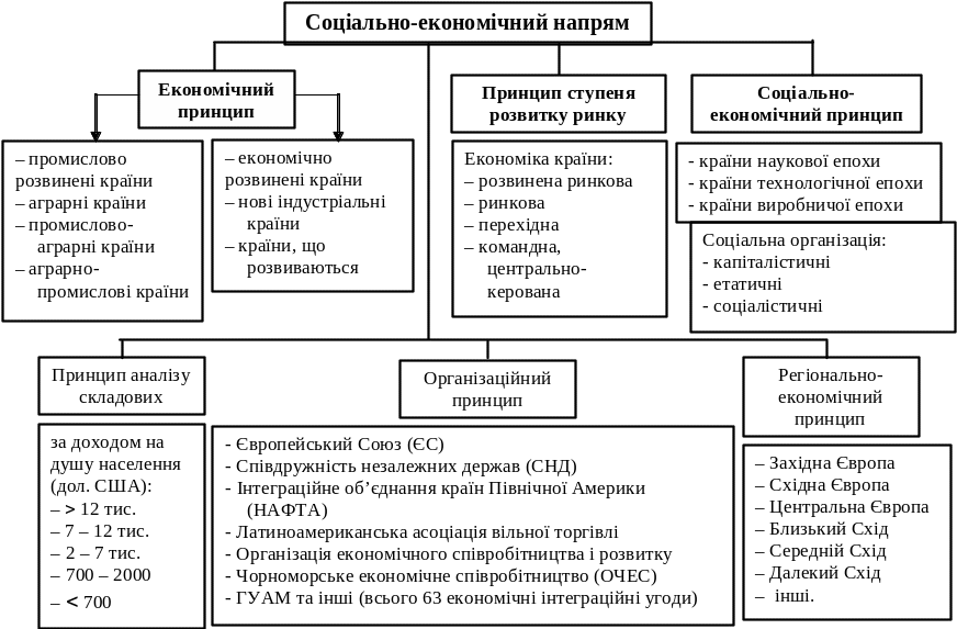 При аналізі структури міжнародної економіки виділяють два основні напрями: політико-соціально-економічний (рис. 1.6.) та соціально-економічний (рис. 1.2).