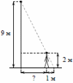 На каком расстоянии (в метрах) от фонаря стоит человек ростом 2 м, если длина его тени равна 1 м, высота фонаря 9 м?