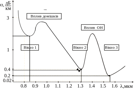 З малюнка очевидно, що an та aр із ростом l зменшуються, а через домішки є істотні резонансні сплески ослаблення на хвилях 0,95 і 1,4 мкм за рахунок гідроксильних груп і інших включень. При цьому чисто кварцові світловоди мають набагато менші домішкові втрати, чим силікатні (багатокомпонентні) світловоди. На малюнку виділені також три вікна прозорості світловода з малим ослабленням у діапазоні довжин хвиль 0,8...0,9; 1,2...1,3; 1,5...1,6 мкм. У цих діапазонах із збільшенням довжини хвилі ослаблення істотно зменшується. Так, при l=0,85мкм маємо a=1,5дБ/км; при l=1,3мкм відповідно a=0,4дБ/км; при l=1,55мкм - a=0,2дБ/км і менше.