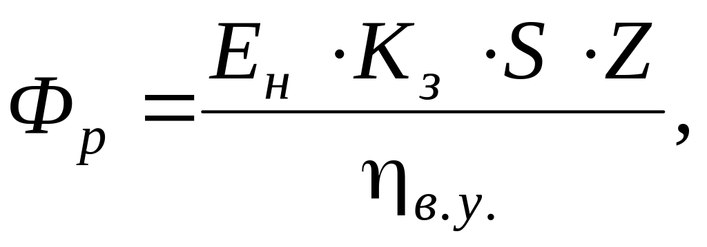 де Ен – мінімальна освітленість, вибрана за нормами, лк; Кз – коефіцієнт запасу, що враховує зниження світлового потоку освітлювальної установки в процесі її експлуатації; S – площа робочої поверхні освітлення, м2; Z = Ec/Emin – коефіцієнт нерівномірності освітлення, рівний відношенню середньої освітленості робочої поверхні до мінімальної освітленості (Z = 1,1 ÷ 1,3).