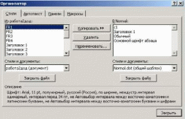 Кнопка <Организатор> ( рис. 2.1) используется для копирования стилей из других документов или шаблонов в текущий документ. Копировать список можно как слева направо, так и справа налево. При этом следует указать файл-источник и файл-приемник стилей. Для указания файла-приемника в диалоговом окне Организатор (рис. 2.3) следует нажать кнопку <Закрыть файл>, которая будет заменена кнопкой <Открыть файл>. Надо нажать эту кнопку, и в окне появятся имеющиеся на диске каталоги и файлы. После выбора имени файла в окне будут показаны установленные в нем стили. Далее следует перейти, например, в левое окно, выбрать стили файла-источника и произвести их копирование с помощью кнопки <Копировать> в правое окно для файла-приемника.