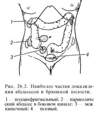 Абсцессы при перитоните возникают в типичных местах, где имеются благоприятные условия для задержки экссудата и отграничения его рыхлыми спайками. Наиболее часто они локализуются в субдиафрагмальном, под-печеночном пространствах, между петлями кишечника, в боковых каналах, в подвздошной ямке, в дугласовом пространстве малого таза. Абсцесс может сформироваться вблизи воспаленного органа (червеобразный отросток, желчный пузырь и др.). Раннее отграничение воспаления предупреждает развитие диффузного перитонита (рис. 26.2).