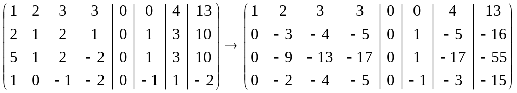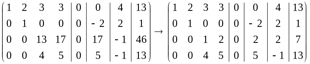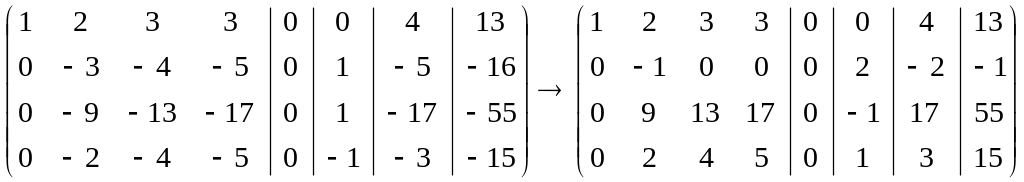 Матрицу справа получили, умножив вторую строку на (-1); складывая третью строку со второй, умноженной на 9; четвёртую строку со второй, умноженной на 2.