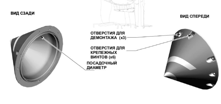 - 6 равномерно расположенных по окружности отверстий предназначены для винтов крепления переднего конуса,