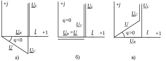 а) емкостной характер цепи; б) резонанс; в) индуктивный характер цепи