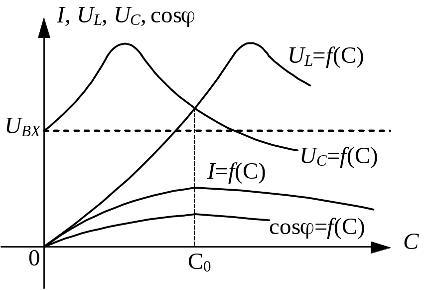 Резонансные кривые в цепи с последовательным соединением R, L, C приведены на рис. 5.4.