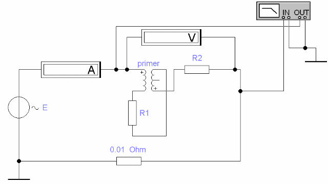 6. Проведите опыт согласного включения индуктивно связанных катушек. В рабочей области EWB измените схему так, как показано на рис. 7.4.