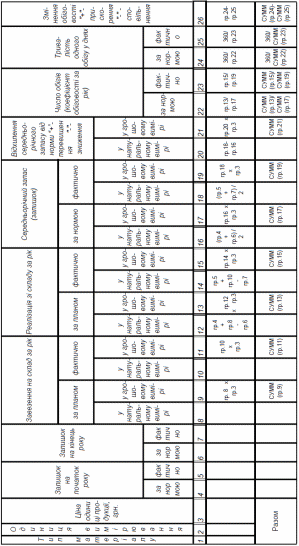Після розрахунку аналітичних показників для окремих типів матеріалів необхідно одержати показники планового й фактичного обсягу оборотних коштів для всіх матеріалів (разом гр.17 і разом гр.19), а також визначити абсолютний і відносний обсяг відвернених або додатково притягнутих оборотних коштів (разом гр.21) і показники оборотності продукції.