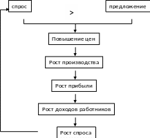 Избыточный спрос приводит к повышению цен => растет прибыль производителей в результате роста производства => увеличиваются денежные доходы работников, что приводит к новому витку увеличения спроса.