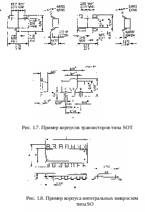 Первый вариант монтируется в отверстия печатных плат (рис. 1.4), второй и третий – на поверхность ПП. Корпуса четвертого варианта выпускаются в основном для монтажа на поверхность.