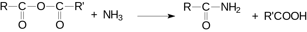 При обработке карбоновых кислот аммиаком или аминами получаются соли. Соли, полученные из аммиака, а также первичных и вторичных аминов в результате пиролиза дают амиды, но этот метод менее удобен, чем реакции аминов с ангидридами, ацилгалогенидами и сложными эфирами, и редко используется в препаративных целях [5].