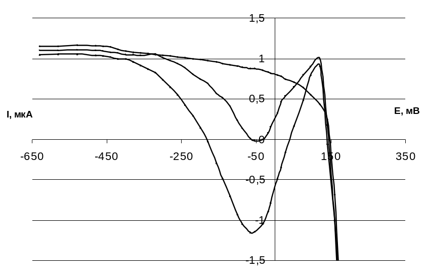 Регистрацию вольтамперограмм повторяли до тех пор, пока относительная разность высот пиков в двух последних вольтамперограммах не будет превышать 5 – 8 % (обычно максимум до четырёх измерений при подготовленной поверхности электрода).