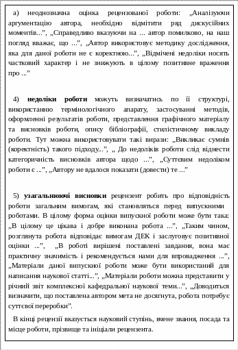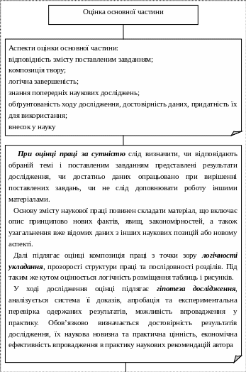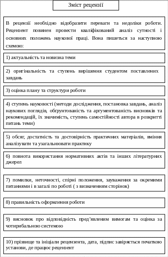Вказується гіпотеза дослідження, аналізується система її доказів, апробація та експериментальна перевірка одержаних результатів, можливість впровадження їх у практику, перевіряється обґрунтованість пропозицій та висновків, що містяться у науковій праці. Обов’язково зазначають достовірність результатів дослідження, їх наукову новизну та практичну цінність, економічну ефективність впровадження у практику наукових рекомендацій автора. Висвітлюється її необхідність для розвитку теорії даної наукової дисципліни (навчальної або практичної діяльності), правильність плану, знання та використання студентом джерел літератури; переконливість розкритих питань наукової роботи, зміст, правильність або дискусійність головних тез; обґрунтованість та аргументованість зроблених висновків та практичних рекомендацій; наукова новизна, теоретична і практична цінність та можливі сфери застосування. У рецензії також зазначають, наскільки автор володіє стилем викладення наукової праці, додержання єдності змісту і форми праці. Особливу увагу звертають на правильність застосування стандарту щодо оформлення наукової праці. Звертається увага на якість оформлення роботи. В кінці рецензії дається оцінка наукової праці |