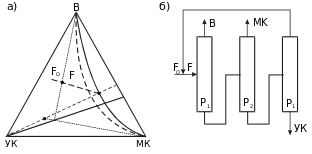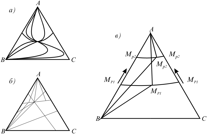 Разнообразие структур фазовых диаграмм "жидкость-пар" обусловлено наличием азеотропов с максимумом и минимумом температур кипения и седловидных азеотропов разного порядка, что приводит, как уже отмечалось, к разбиению концентрационного симплекса на ряд областей развития процесса. Разделение таких смесей на чистые компоненты или фракции заданного состава возможно при использовании принципа перераспределения полей концентраций (ПППК) между областями разделения.