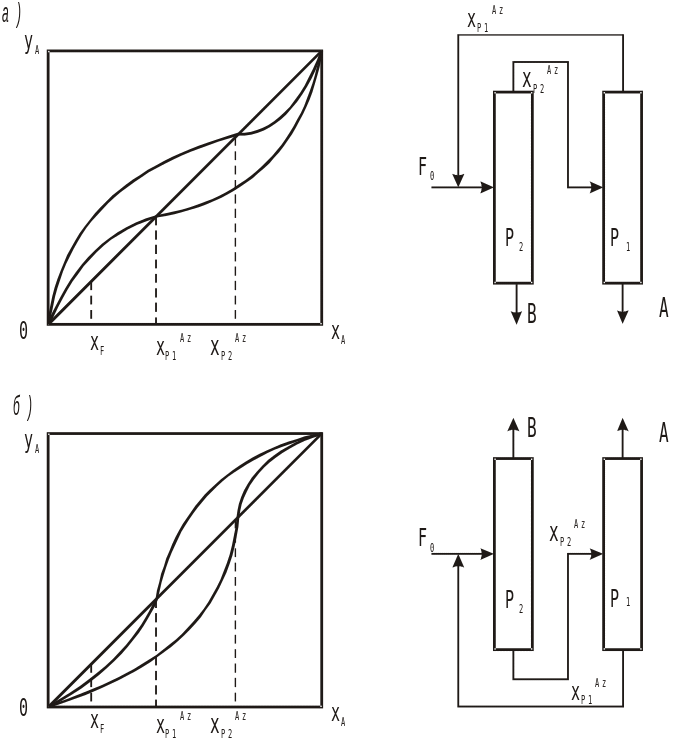 Рис. 7.3. Разделение бинарных азеотропных смесей в комплексах колонн, работающих под разным давлением а) положительный азеотроп; б) отрицательный азеотроп