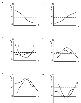 Рис. 7.2. Возможные виды зависимостей состава азеотропа от температуры