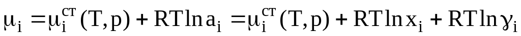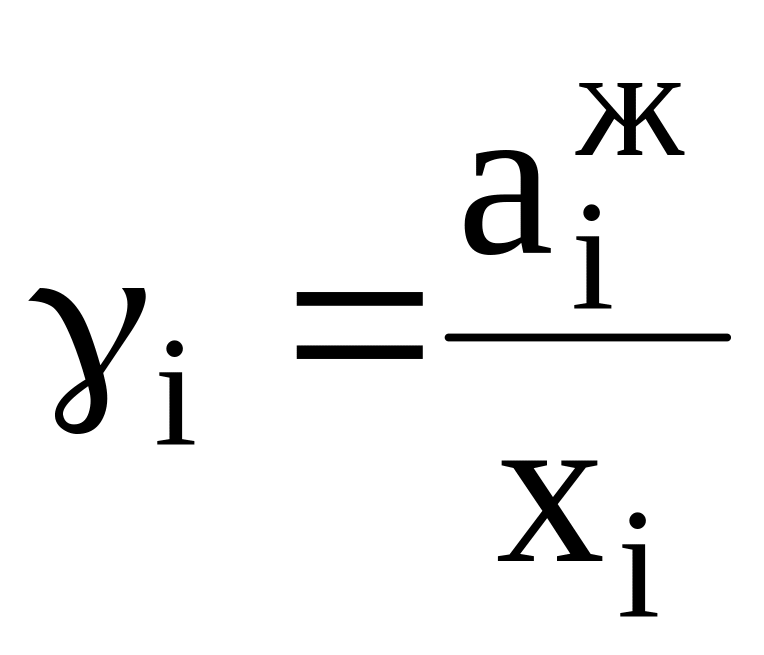 Для описания свойств жидкой фазы, представляющей неидеальный раствор, введены понятия активности (а) и коэффициента активности (), которые определяются следующим образом: