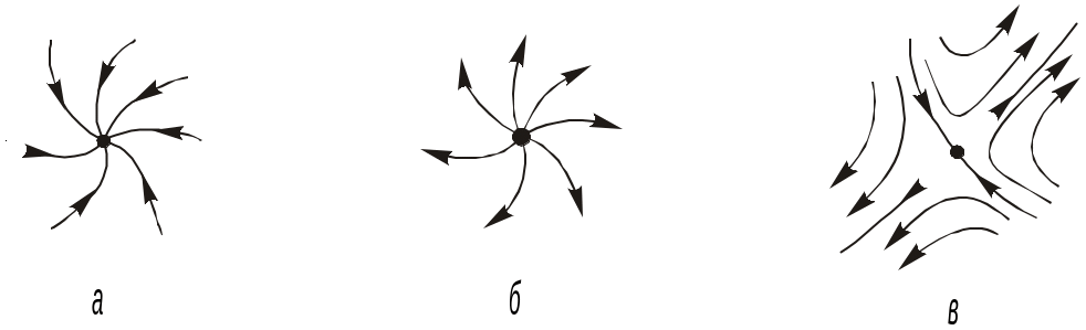 Рис. 3.1. Особые точки траекторий дистилляции в трехкомпонентных смесях: а - устойчивый узел; б - неустойчивый узел; в - седло