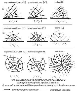 Интегральные линии дифференциального уравнения дистилляции называются траекториями дистилляции (дистилляционными линиями или линиями равновесного открытого испарения) . Эти траектории в окрестности особой точки имеют своеобразный ход.