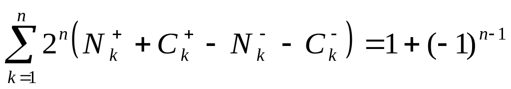 Если обозначить: N+ — узлы с положительным индексом, N- — узлы с отрицательным индексом, С+ — седла с положительным индексом и С- — седла с отрицательным индексом, то уравнение связи этих особых точек, предложенное Жаровым В. Т., имеет вид: