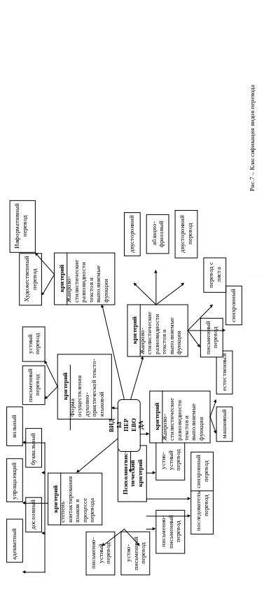 Как видим, классификация видов перевода дается по различным критериям: 1) по форме осуществления духовно-практической, тексто-языковой деятельности; 2) на основании учета деятельности умственных механизмов; 3) психолингвистическая классификация; 4) по жанрово-стилистической особенности текстов и по выполняемым доминирующим функциям; 5) на основе учета степени контактирования языков в процессе переводческой деятельности; 6) в зависимости от того, кто осуществляет перевод. Выделение разнообразных видов перевода обусловлено существованием различных условий осуществления переводческого процесса, разнообразием выполняемых переводом функций, характером воспринимаемой информации и др. признаками. Общую классификацию видов перевода на основе вышеизложенных критериев можно увидеть в схеме №7.
