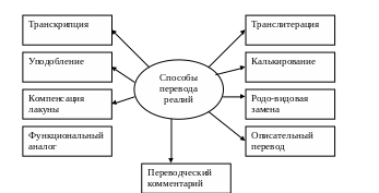 а) транслитерация или транскрипция; б) создание нового слова; в) использование слова, обозначающего нечто близкое (хотя и не тождественное) по функции к иноязычной реалии; г) обобщенно-приблизительный перевод, при котором слова ИЯ, обозначающие видовые понятия, передаются словами ПЯ, называющие понятия родовое