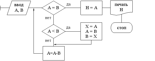 Существенным недостатком алгоритмических языков является то, что представленные их средствами алгоритмы недостаточно наглядны, довольно объемны и громоздки. Описания сложных математических задач или процессов управления занимают сотни страниц. Сделать описание алгоритма более наглядным помогает его графическое изображение в виде структурной схемы. На рис.1 представлена схема алгоритма Евклида.