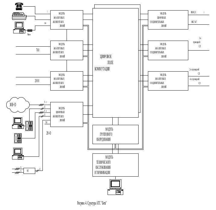 АТС "Бета" позволяет подключить два типа абонентов: аналоговых (обычных) и цифровых. Аналоговые абоненты кроме телефона могут подключать модемы для передачи данных, факсы группы 2 или 3 (рис.3). А цифровые абоненты получают право посредством специального блока NBTA (комплект оконечного устройства) пользоваться дополнительными услугами:
